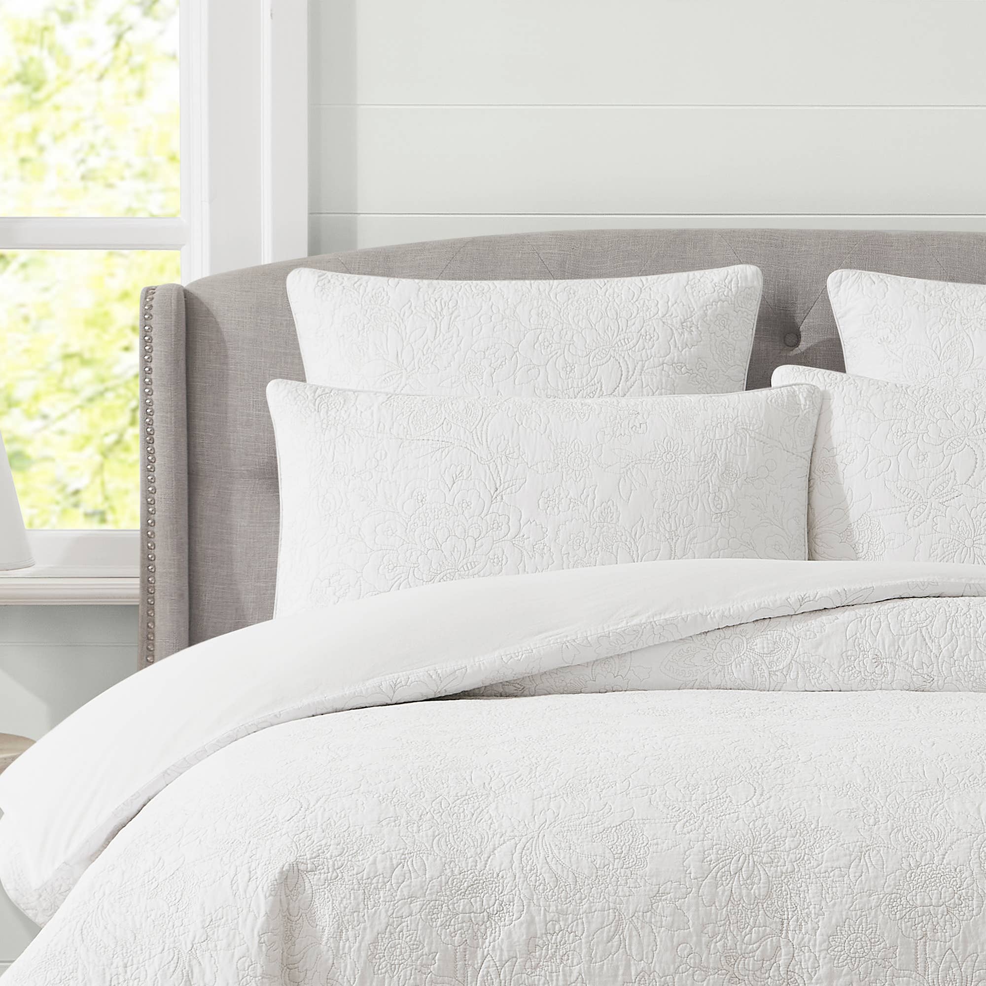 Experience understated luxury with the Trailing Laurissa set, featuring a delicately embroidered jacobean floral design. The subtle embroidery adds a touch of intricate detail, elevating the overall aesthetic and creating a bedding set that exudes enduring charm.
