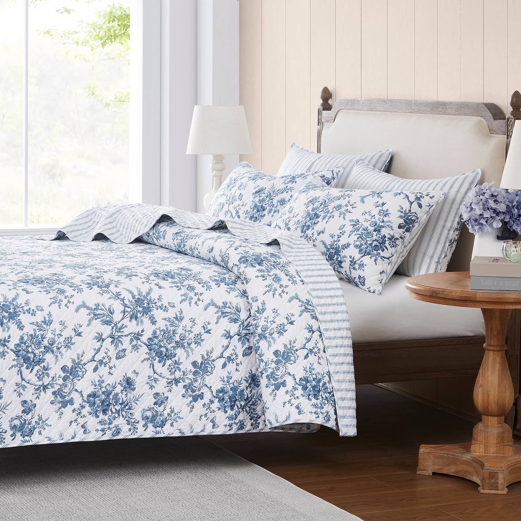 Combining the beauty of an English country home with the vintage elegance of the classic Laura Ashley floral. A reversable design in a calming tonal navy way.
