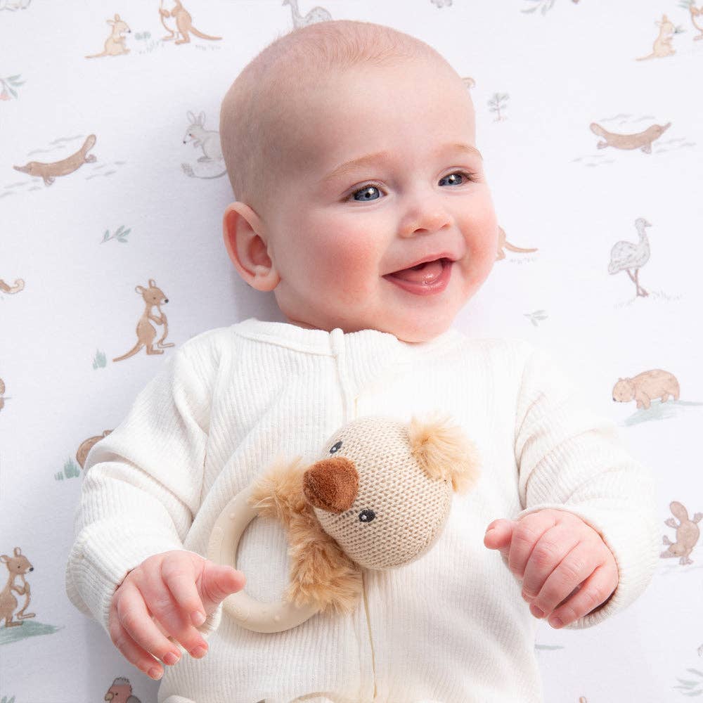 Crafted from soft cotton knit with a handmade feel, it features a gentle jingle and a BPA-free silicone teether ring - perfect for tiny hands and growing gums.